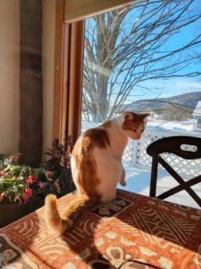 There is absolutely no landscape I like better than a snowy vista sparkling in the sun, whether I’m cozy and warm and looking out the window (as I am now) or skiing, walking or snowshoeing through winding trails with heavy snow-coated conifers, or even when I’m shoveling the driveway–as I was earlier this morning, enjoying the workout even as my partner and i struggled with our (temporarily) compromised respiratory systems to lift the heavy snow.
